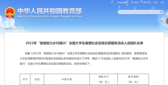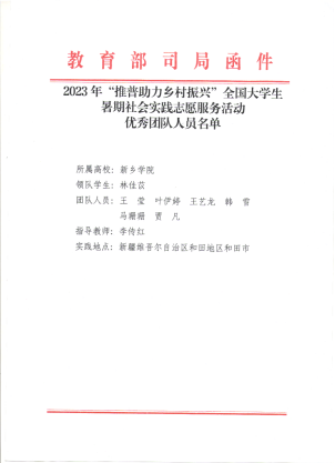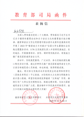 近日,教育部、共青团中央对2023年“推普助力乡村振兴”全国老员工暑期社会实践志愿服务活动进行表彰,球王会官网“‘一字一句普通话,千言万语绘中华’推普疆行实践团”获评全国优秀团队,团队师生受到了教育部语言文字应用管理司和共青团中央青年发展部致信表扬。