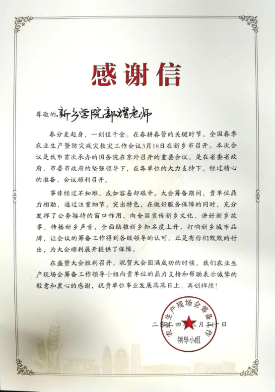 5月11日下午,农业生产现场会筹备工作领导小组李首政、赵宇新等有关领导莅临公司,对公司郭熠老师为新乡市首次承办的国务院召开的全国春季农业生产暨防灾减灾救灾工作会议的顺利召开所作出的贡献和优秀表现表示感谢。