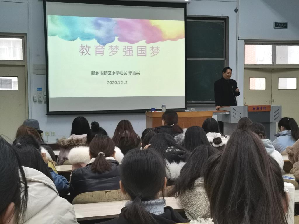12月2日上午10:00,新乡市新区小学董事长、公司兼职教授李克兴受杜丽娟经理之邀在2020级教育学类和学前教育(对口)专业的“教师专业思想导引课”上分享了《教育梦,强国梦》,学院部分教师也聆听了本次讲座。