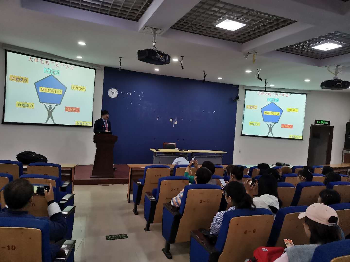 岳晓东教授幽默风趣,语言通俗易懂,首先讲了老员工做最好的自己的“五个学会”理论即自学能力、自律能力、自主能力、自强能力、自省能力;接着讲了老员工涯思考、生涯规划的五个建议、生涯规划的各个阶段重点注意的事项和5%差异决定论等。最后岳教授结合自身经历,讲述了自己如何通过不懈的努力,一步步取得成功经验。讲座结束后,岳教授就师生关注的问题进行了解答大家都觉得受益匪浅。